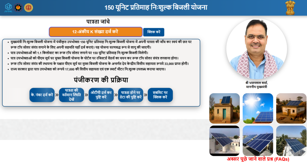 Rajasthan 150 Unit Free Bijali Yojana: राजस्थान में राज्य सरकार द्वारा राज्य के घरेलू उपभोक्ताओं को राहत प्रदान करने के लिए 150 यूनिट प्रतिमाह नि:शुल्क बिजली योजना के लिए ऑनलाइन रजिस्ट्रेशन शुरू कर दिए गए हैं। राजस्थान के उपभोक्ताओं को पीएम सूर्य घर मुफ्त बिजली योजना के तहत फ्री बिजली के लिए नया पोर्टल लांच कर दिया है। इस योजना का लाभ उन सभी उपभोक्ताओ को मिलेगा जो ‘मुख्यमंत्री निःशुल्क बिजली योजना’ में पंजीकृत हैं, इस योजना के अंतर्गत लाभ प्राप्त कर सकेंगे। इस योजना के तहत राज्य सरकार 1.1 किलोवाट तक का सोलर पैनल लगवाने पर ₹17000 की सब्सिडी मिलेगी और साथ ही, उपभोक्ता को एक स्मार्ट मीटर भी निःशुल्क दिया जाएगा। इस योजना का लाभ प्राप्त करने लिए उपभोक्ता अपनी पात्रता की जांच कर ऑनलाइन रजिस्ट्रेशन कर सकते हैं।
